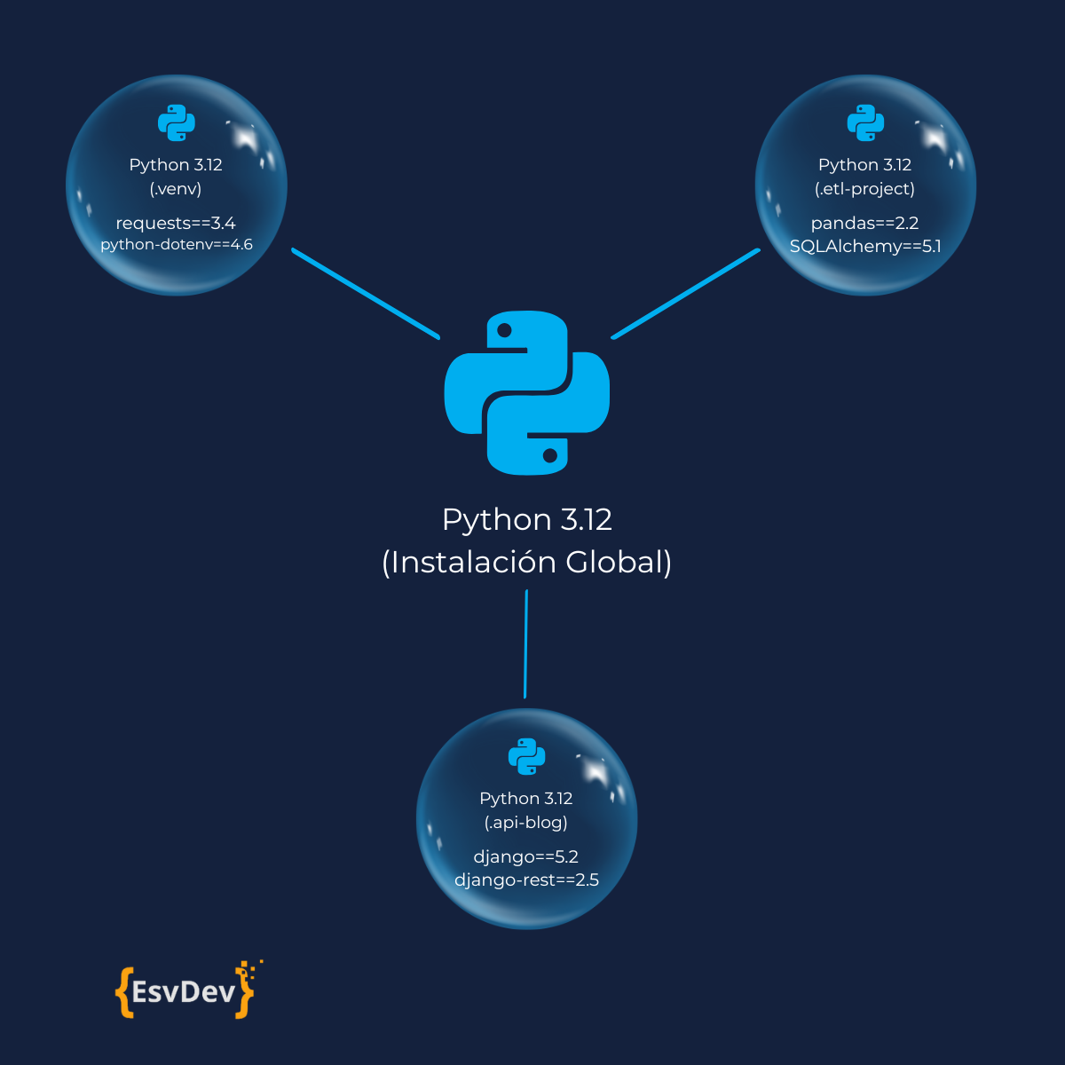 Cada proyecto tiene su propio mini-Python, con sus librerías, sus versiones y su ecosistema independiente del resto del sistema.
